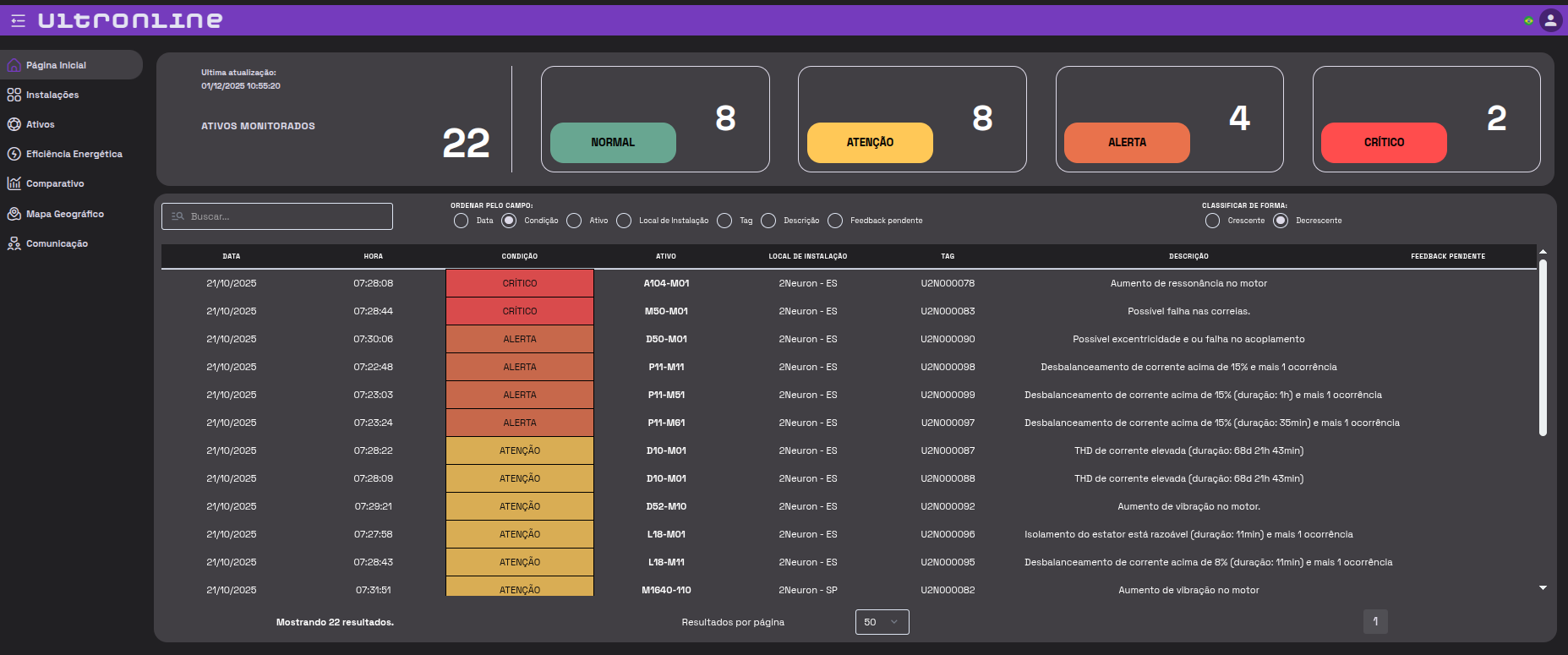 Com a Plataforma Web do Ultronline, você terá à disposição gráficos, indicadores e alertas sobre o desempenho e a condição dos seus ativos em tempo real.